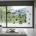 Eleganter Fensteraufkleber mit Baum, Vogelkäfig und fliegenden Vögeln – ideal für grosse Fensterfronten, Terrassentüren oder Wohnräume.